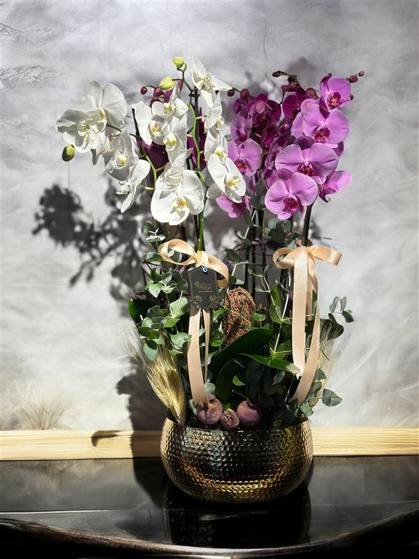 “Zarafetin ve şıklığın buluştuğu bu lüks orkide aranjmanı, 8 dallı birinci kalite 4 pembe ve 4 beyaz orkidenin muhteşem uyumuyla hazırlanmıştır. Gold vazo içerisinde yer alan bu özel tasarım, kuru çiçeklerle zenginleştirilerek her mekâna sofistike bir hava katıyor. Orkidelerin göz alıcı güzelliği, altın vazonun parlaklığıyla birleşerek göz alıcı bir atmosfer yaratıyor. Sevdiklerinize özel anlarında unutulmaz bir hediye sunmak ya da evinize zarif bir dokunuş katmak için mükemmel bir tercih.