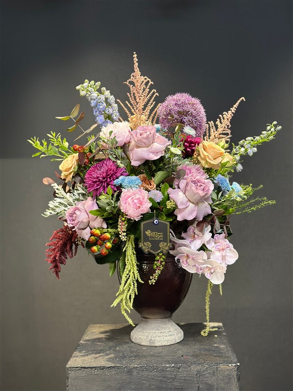 Koyu tonlarda zarif bir vazo içerisinde, pastel güllerin yumuşak romantizmi, orkidenin asil güzelliği, alliumun sanatsal havası, anastasiaların ihtişamı ve mevsimsel çiçeklerin canlı dokusu bir araya geliyor. Renklerin büyüleyici uyumu ve farklı dokuların ahenkli birleşimiyle bu aranjman, adeta doğanın bir sanat tablosu gibi göz kamaştırıyor.