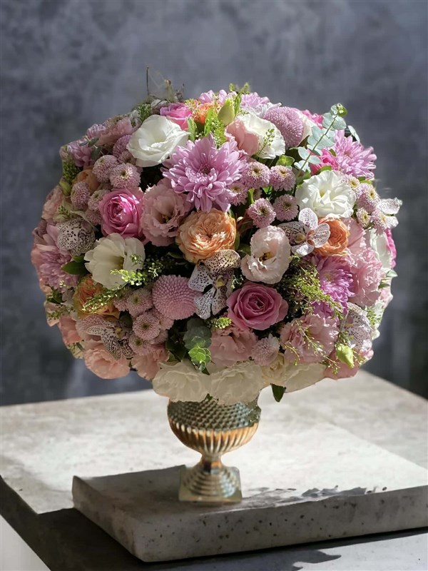 Our arrangement, prepared in a glass vase, features Anastasia flowers, salmon roses, pink roses, and other seasonal flowers in soft tones. The product height is 65 cm. The product volume can be increased or decreased. You can specify your special orders according to your budget. The vase underneath can be changed upon request. You can request photos and information via WhatsApp.