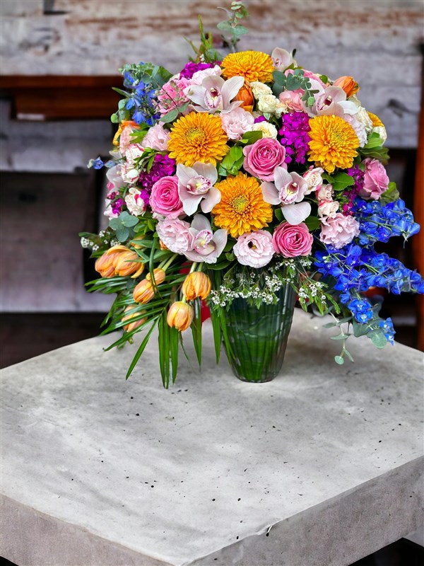 "Renkli Bahar: Dekoratif Cam Vazodaki Çiçek Şöleni"**Sarı Frezya Çiçekçilik olarak, doğanın renklerini ve tazeliğini özel bir aranjmanda birleştirdik! Turuncu Anastasialar ve Laleler, Cymbidium Beyaz Orkideler, Pembe Güller, Lisyantuslar, Çardak Güller ve Mavi Delphinium'larla süslenmiş bu muhteşem aranjman, dekoratif cam vazo içinde baharın tüm güzelliklerini sizinle buluşturuyor.**Renk Cümbüşü:**Turuncu, beyaz, pembe ve mavi... Renklerin dansıyla süslenmiş bu aranjman, bir çiçek şölenine dönüşüyor. Her bir çiçeğin özel dokusu ve rengi, doğanın zenginliğini en güzel şekilde yansıtıyor.**Dekoratif Cam Vazo:**Aranjman, özel olarak seçilmiş dekoratif cam vazo içinde sunuluyor. Zarafetiyle göz kamaştıran vazo, çiçeklerin güzelliğini daha da vurguluyor. Bir sanat eseri gibi duran bu vazo, her mekana sofistike bir hava katıyor.**Farklı Çiçek Dokuları:**Turuncu Anastasialar ve Lalelerin enerjisi, Cymbidium Beyaz Orkidelerin zarafeti, Pembe Güllerin romantizmi, Lisyantusların şıklığı, Çardak Güllerin zarafeti ve Mavi Delphinium'ların hafifliği... Bu çiçekler, bir araya geldiklerinde adeta bir harmoni orkestrası gibi eşsiz bir müzik çıkarıyor.**Her Anı Özel Kılın:**Bu aranjman, evinizi renklendirmek, özel günleri taçlandırmak veya sevdiklerinize unutulmaz bir hediye sunmak için mükemmel bir seçenek. Her detayı düşünülmüş bu çiçek şöleni, her anı özel kılacak.Doğanın güzelliklerini evinize getirmek ve sevdiklerinizi şaşırtmak için bu muhteşem aranjmanı hemen sipariş edebilirsiniz.