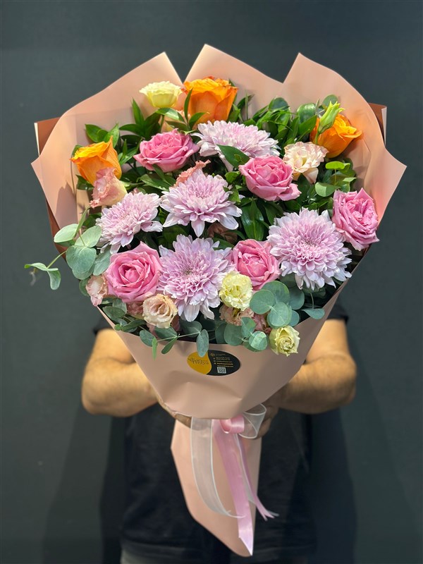 Anastasialar,turuncu ve pembe güller , mevsim yeşillikleri ile hazırlanmış buketimiz.