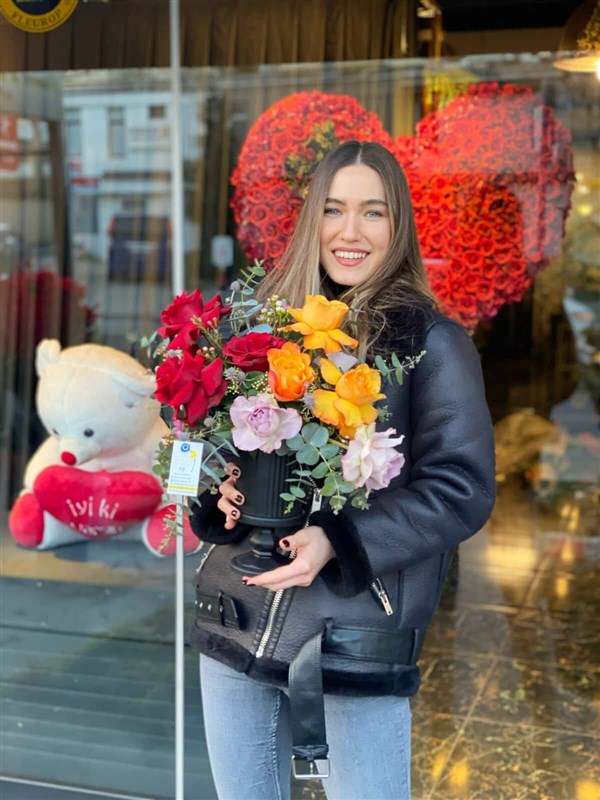 “Renklerin ve kokuların dansı, bu özel aranjmanda hayat buluyor. İçerisinde 3 kırmızı ve 3 turuncu Hollanda gülü ile 2 adet Memory Lane lila gülü bulunan bu tasarım, canlı ve göz alıcı bir görünüm sunuyor. Eucalyptus yapraklarıyla zenginleştirilen ve mevsim çiçekleriyle süslenen bu aranjman, hem modern hem de doğal bir estetik taşıyor. Her detayında sevgi ve özenle hazırlanmış bu özel aranjman, sevdiklerinizi mutlu etmek ya da mekanınıza sıcak bir hava katmak için mükemmel bir tercih.”