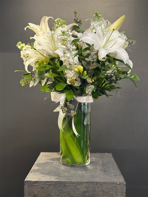 Beyaz lilyumların asil duruşu, mevsimsel beyaz çiçeklerin zarif dokunuşları ve taze yeşilliklerin doğallığı ile hazırlanan bu şık aranjman, sadeliğin en büyüleyici halini sunuyor. Cam vazo içerisinde zarif bir şekilde sergilenen çiçekler, her ortama ferahlık ve zarafet katarken, aynı zamanda huzur ve saflığın da simgesi oluyor.