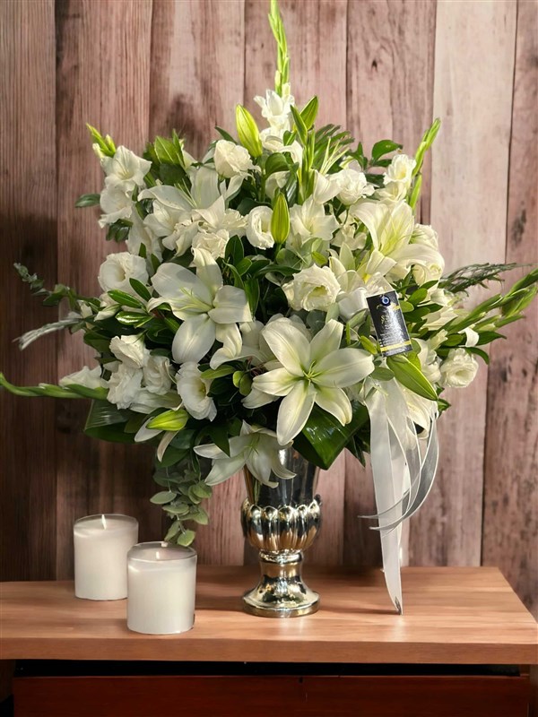 🌸 Zarafet ve Şıklığın İfadesi: Gümüş Cam Vazo İçinde Bembeyaz Lilyumlarla Hazırlanan Cepheli Aranjman 🌿Bembeyaz lilyumların saf güzelliği, çeşitli ithal yapraklar ve zarif glayöllerle bir araya gelerek Gümüş Cam Vazo İçindeki Cepheli Aranjman'ı oluşturuyor. Bu özel aranjman, zarafet ve şıklığın en güzel ifadesini sunuyor.🌸 Bembeyaz Lilyumların Saflığı: Lilyumlar, saf ve masum güzellikleriyle bilinir. Bu aranjmanda, beyaz lilyumların çekiciliğiyle etkileyici bir kompozisyon yaratılıyor.🌿 İthal Yaprakların Dokusu: Çeşitli ithal yapraklar, aranjmanın zenginliğini ve derinliğini vurguluyor. Her bir yaprak, doğadan gelen özgün dokusuyla dikkat çekiyor.🌸 Glayölle Zarafet: Glayölle süslenen aranjman, zarifliği ve sofistike dokunuşu ile öne çıkıyor. Glayöl çiçekleri, bu aranjmana ayrı bir estetik katıyor.🌿 Etkileyici Görünüm:Gümüş Cam Vazo İçinde Bembeyaz Lilyumlarla Hazırlanan Cepheli Aranjman, evinizi veya ofisinizi etkileyici bir zarafetle donatıyor. Bembeyaz lilyumların, ithal yaprakların ve glayöl çiçeklerinin birlikteliği, estetik bir denge oluşturuyor. Şıklığın ifadesi olan bu aranjmanla mekanlarınıza zarafet katın.