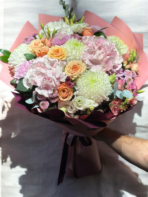 “Pembe ortancaların zarafeti, beyaz anastasiaların saf güzelliğiyle buluşuyor. Khala soft renk güller ve yuvarlak krizantemlerin uyumu, bu buketi pastel tonlarda adeta bir sanat eserine dönüştürüyor. Her detayıyla huzur ve zarafeti yansıtan bu muhteşem aranjman, özel anlarınızı daha da anlamlı kılmak için tasarlandı. Pastel renklerin sakinleştirici etkisiyle sevdiklerinize yumuşak bir dokunuş armağan edin.”
