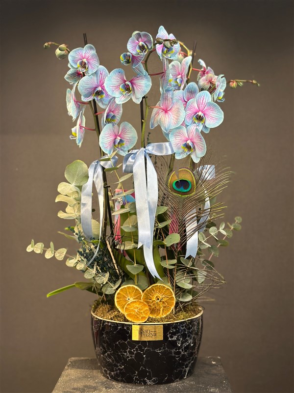 Pastel mavi–pembe geçişli egzotik orkide çiçekleri, siyah mermer görünümlü premium seramik saksı içinde; okaliptus, otları, pavon tüyü ve kuru portakal dilimleriyle benzersiz bir kompozisyona dönüşüyor.