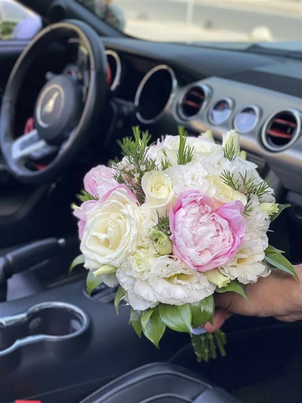 Pembe ve beyaz şakayıklar ,güller , lisyantuslar, vaxlarla hazırlanmış çok şık gelin buketimiz
