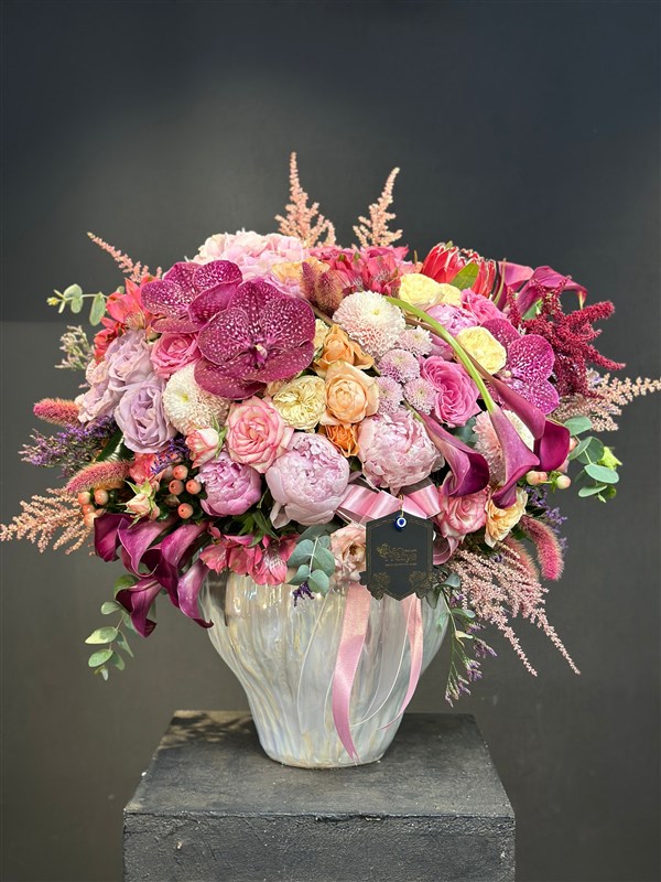 Sıradan çiçeklerden çok daha fazlası… Magnifica, adını İtalyanca’da “görkemli, muhteşem” anlamından alıyor ve tam da öyle görünüyor. Mor orkidelerin asil ihtişamı, pembe şakayıkların romantik zarafeti, güllerin eşsiz güzelliği ve egzotik çiçeklerin dokunuşuyla hazırlanan bu aranjman, göz alıcı ihtişamıyla adeta nefes kesiyor.