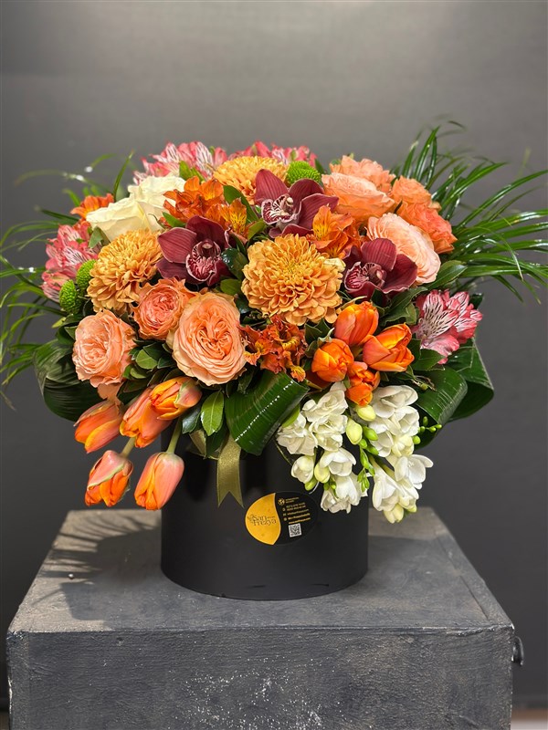 İçerisinde Anastasia ,khala güller orkideler laleler ve mevsim çiçekleriyle hazırlanmış kutu çerisinde ki şık aranjmanımız.Gittiği yerde kendini hayran bırakır.Ürün boyu 45 cm.Ürün hacmi büyütülebilir veya küçültülebilir.Özel siparişlerinizi bütçenize göre belirtebilirsiniz.Altındaki kutu rengi isteğe göre değişebilir.Whatsapp üzerinden fotoğraf isteyebilir , bilgi alabilirsiniz.