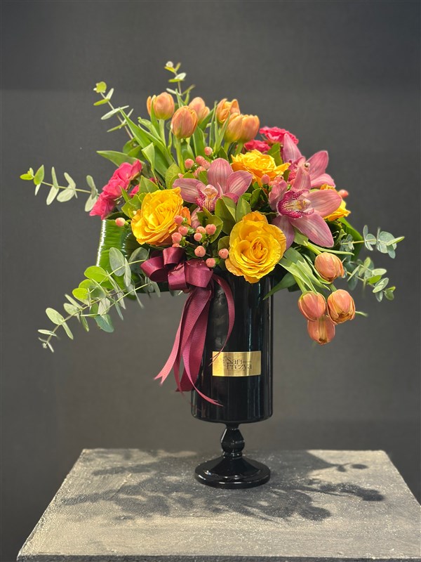 Siyah şık vazo içerisinde hazırlanan bu göz alıcı tasarım; tıpkı sahnede dans eden çiçekler gibi canlı, neşeli ve büyüleyici… Baharın tüm tazeliğini ve güneşin sıcaklığını taşıyan bu aranjman, sevdiklerinize pozitif enerji dolu bir sürpriz sunmak için ideal.