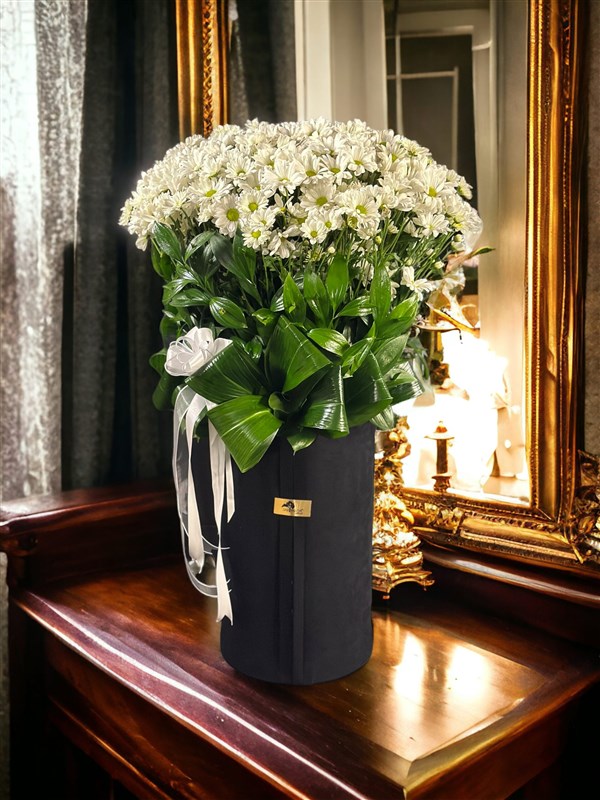 Siyah kadife dev kutu içerisinde özenle hazırlanmış papatya aranjmanımızGittiği yerde kendini hayran bırakır.Ürün boyu 1 metredir .Ürün hacmi büyütülebilir veya küçültülebilir.Özel siparişlerinizi bütçenize göre belirtebilirsiniz.Altındaki kutu isteğe göre büyütülebilirWhatsapp üzerinden fotoğraf isteyebilir , bilgi alabilirsiniz.