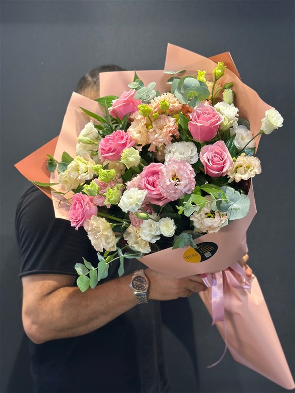 İçerisinde , i pembe güller lisyantuslar ve mevsim çiçekleriyle hazırlanmış şık buketimiz.