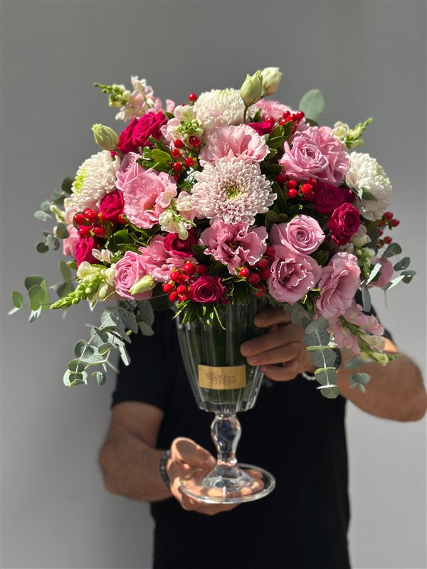 Şık cam kadeh vazo içerisinde birbirinden taze çiçeklerle hazırlanan Emma, zarifliğin ve şıklığın buluştuğu özel bir aranjmandır. Pembe güllerin romantik dokunuşu, lisyantusların zarif güzelliği, anastasia çiçeklerinin gösterişli formu ve hypericum tanelerinin enerjisi, mevsim çiçekleriyle harmanlanarak göz alıcı bir bütünlük oluşturur.