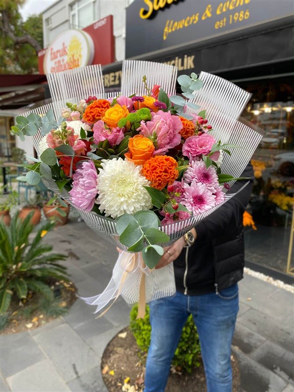 Birbirinden taze mevsim çiçekleriyle hazırlanmış buketimiz.