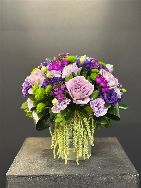 "Color your emotions and express your love in the most beautiful way with the elegance of lilac and purple in a glass vase. This arrangement will not only offer a visual feast but also help you create unforgettable memories by enveloping your loved ones."