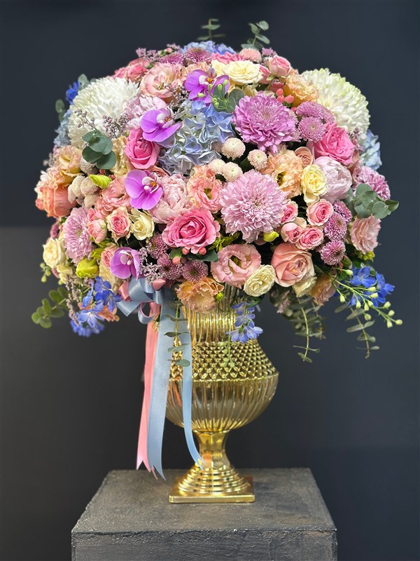 Işıltılı altın vazo içerisinde, pembe ve pastel güllerin romantik dokunuşu, orkidenin asaleti, ortancaların büyüleyici renk geçişleri, anastasiaların ihtişamı ve özel krizantemlerin zarif dokusu bir araya geliyor. Özenle seçilmiş her çiçek, bu aranjmana masalsı bir ihtişam ve zamansız bir şıklık katıyor.
