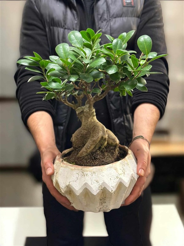 Bonsai, yaşayan ağaçlara duyulan saygıyı ve bu ağaçların yaşamasını konu alan bir sanattır. Bonsailer minyatür olmalarına rağmen çevremizde gördüğümüz ağaçlardan hiçbir farkları yoktur. Özenle seçilen ağaç dalları, budanarak ve ilgiyle yetiştirilerek minyatür ağaç görünümü kazanır. Ürün altındaki obje isteğe ve zaruriyete göre değişebilir. Ficus Ginseng Bonsai-XLHer Bonsai'nin kendine has, eşsiz şekli olduğundangönderim yapılacak bonsaide ufak farklılıklar olmaktadır.Ficus Microcarpa Ginseng Bonsai, Bonsai tarzında yetiştirilen bir sevimli küçük ev bitkisidir.Bu çarpıcı garip şekilli mikrocarpa Ficus 'Ginseng'i önemli bir alana konumlandırın ki,böylece tüm gün hayranlıkla görünebilir.Yaz aylarında ficus, verandada veya terasta açık havada bakılabilir fakat gün ortası güneşinden koruyunuz.Ficus microcarpa 'Ginseng'inizi toprağının hafif nemli kalmasından çok hoşalanacaktır fakat bu demek değildir ki sulu bir toprak, odunsu gövdeye sahip bonsailer çok hafif nemli bir toprakta kalmayı severler. Bir periyoda bağlı kalmaksızın toprağını elimizle kontrol ederek su ihtiyacını tespit etmek esastır.Ginseng Çincede 'kök' anlamındadır,Ficus 'Ginseng' İç mekanlarınızda kök görünümünde güzel bir gösteri sunmaktadır.Bitki formunu korumak için düzenli budama yapılmalıdır. Aydınlık ortam gelişimi için ideal olacaktır. Toprağının hafif nemli kalmasını sever fakat su altında olmadığından emin olunuz. Aşırı soğuk ve sıcaktan korunmalıdır. Evcil dostlarımız için ağız yolu ile temasta toksik etkilidir