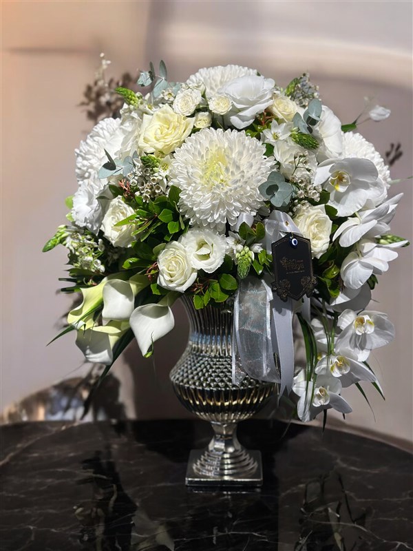 "Beyazın Büyüsü: Gümüş Vintage Cam Vazo İçerisinde Dans Eden Çiçekler"**Eleganlık ve zarafetin simgesi beyaz çiçekler, gümüş cam vazo içinde adeta bir dansa koyuluyor. Bu muhteşem beyaz aranjman,, lisyantus, Anastasia, gala ve orkidelerle, doğanın en zarif yönlerini bir araya getiriyor.**Gümüş Cam Vazo:**Aranjmanın taşıyıcısı olan gümüş cam vazo, zarafeti ve modern şıklığı bir araya getiriyor. Bu özel vazo, içindeki beyaz çiçeklerle muazzam bir uyum yakalayarak mekanınıza büyülü bir atmosfer katıyor.***Lisyantus:**Lisyantus, zarafetin ve kalıcılığın simgesidir. Bu çiçekler, aranjmana dayanıklılık ve uzun ömür katarak, özel anlarınızı daha da özel kılıyor.**Anastasia:**Anastasia çiçekleri, muhteşem beyaz rengiyle dikkat çekiyor. Büyüleyici dokuları ve zarif açılışlarıyla aranjmanı tamamlayan bir güzellik sunuyorlar.**Gala ve Orkideler:**Gala çiçekleri, şıklığı ve zarafeti temsil ederken, orkideler zarafetin egzotik yüzünü sergiliyor. Bu iki çiçek türü, aranjmana derinlik katarak, adeta bir dansın parçası gibi birbirleriyle uyum içinde.**Her Özel An İçin Mükemmel Bir Seçenek:**Bu muhteşem aranjman, sadece ev dekorasyonunuz için değil, aynı zamanda isteme, nişan veya tanışma gibi özel günlerde de unutulmaz bir seçenek sunuyor. Sevgilinizle geçireceğiniz romantik anları taçlandırmak veya sevdiklerinizle başlangıç noktanızı şenlendirmek için mükemmel bir tercih.