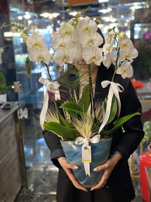 İthal orkideler kuru çiçekler ve tavuskuşu tüyü ile süslenmiş cam vazo içerisinde muhteşem sunum .