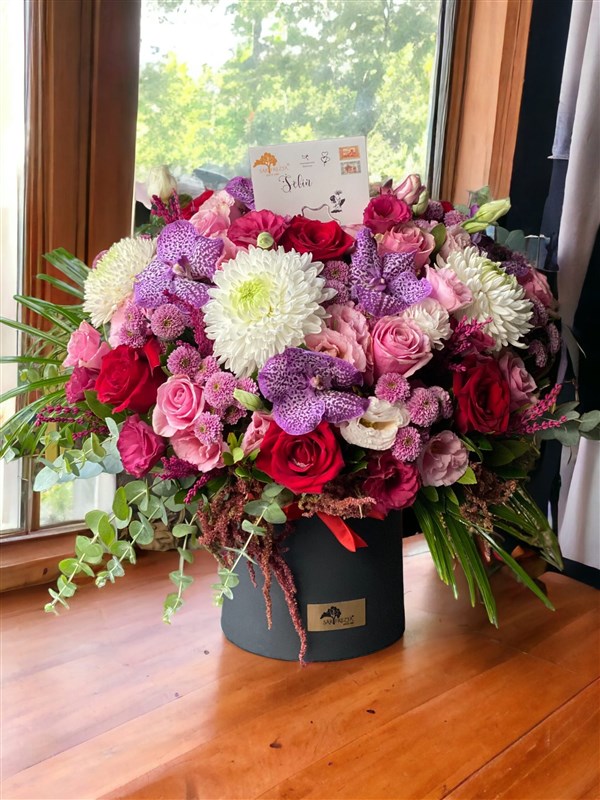 "Zamansız Şıklık: Siyah Kutuda Muhteşem Çiçek Şöleni"**Sarı Frezya Çiçekçilik olarak, sizlere özel bir zarafet sunmaktan büyük mutluluk duyuyoruz! Siyah kutu içerisindeki bu büyüleyici aranjman, kırmızı ithal güller, beyaz Anastasialar, muhteşem vanda orkideler, pembe güller ve mevsim çiçekleri ile enfes bir çiçek şöleni sunuyor.**Siyah Kutu:**Zamansız şıklığın temsilcisi siyah kutu, içindeki çiçekleri adeta bir sanat eseri gibi sunuyor. Bu özel kutu, çiçekleri zarif bir şekilde çevreleyerek şıklığı ve gizemi bir araya getiriyor.**Kırmızı İthal Güller:**Aranjmanın yıldızlarından olan kırmızı ithal güller, aşkın ve tutkunun en etkileyici sembollerinden biri. Her biri özenle seçilmiş, derin kırmızısıyla duygu dolu bir atmosfer yaratıyor.**Beyaz Anastasialar:**Beyaz Anastasialar, zarif dokuları ve yüksek kaliteleriyle aranjmanı zenginleştiren unsurlardan biri. Temiz beyaz renkleri, bu çiçekleri adeta bir zarafet sembolüne dönüştürüyor.**Muhteşem Vanda Orkideler:**Vanda orkideler, aranjmana egzotik bir hava katıyor. Muhteşem renkleri ve zarif yapısıyla dikkat çeken bu orkideler, şıklığı doruk noktasına taşıyor.**Pembe Güller ve Mevsim Çiçekleri:**Pembe güller ve mevsim çiçekleri, aranjmanı taze ve doğal kılan unsurlar. Bu çiçeklerin birleşimi, çiçek şölenini tam anlamıyla bir renk paletine dönüştürüyor.Siyah kutu içindeki bu büyüleyici aranjman, kırmızının tutkusu ve beyazın zarafeti arasında kusursuz bir denge yakalıyor. Her detayı özenle düşünülmüş, gözleri ve kalpleri okşayan bu çiçek şöleni, özel anlarınıza unutulmaz bir atmosfer katmak için tasarlandı.Evinizi renklendirmek, sevdiklerinizi mutlu etmek veya duygularınızı ifade etmek için bu muhteşem aranjmanı hemen sipariş edebilirsiniz.