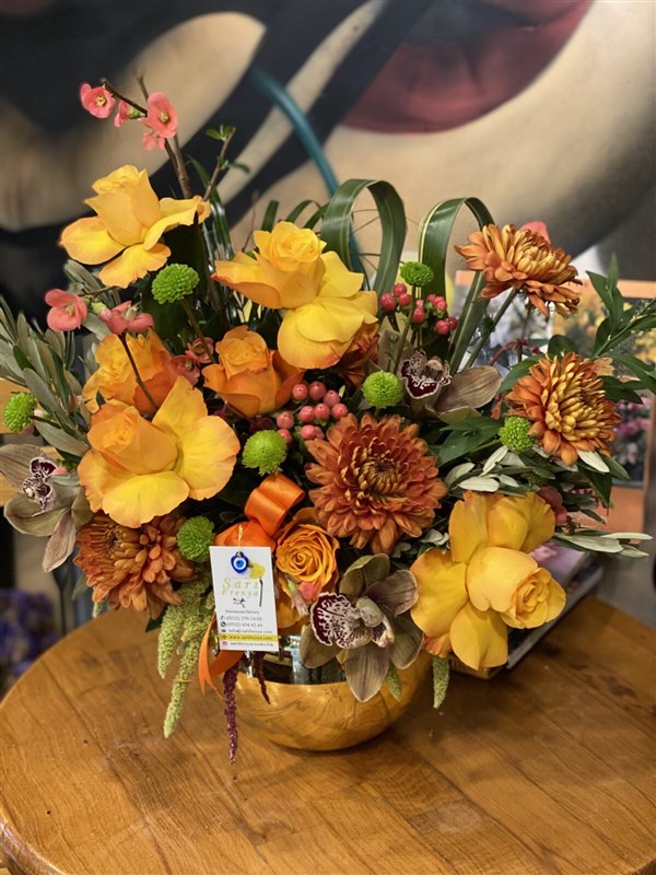 Gold cam fanus içerisine hazırlanmış anastasialar , ithal güller , hypericumlarla hazırlanmış aranjmanımız.