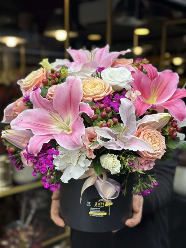 İçerisinde lilyumlar , güller ve mevsim çiçekleriyle hazırlanmış siyah kutu içerisinde ki şık aranjmanımız.Gittiği yerde kokusuyla kendini hayran bırakır.Ürün boyu 35 cm.Ürün hacmi büyütülebilir veya küçültülebilir.Özel siparişlerinizi bütçenize göre belirtebilirsiniz.Altındaki vazo isteğe göre değişebilir.Whatsapp üzerinden fotoğraf isteyebilir , bilgi alabilirsiniz.