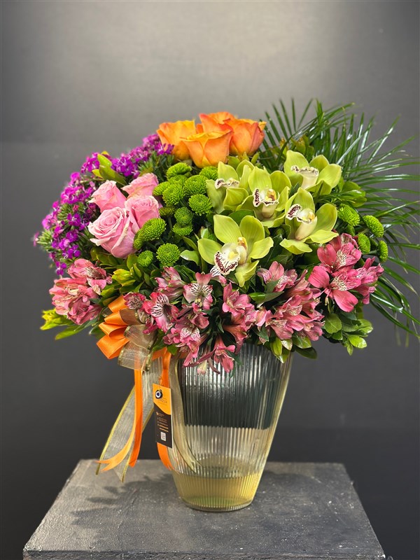 Birbirinden taze cymbidium orkide, ithal güller ,astromelia , mevsim yeşillikleri ile hazırlanmış aranjmanımız.