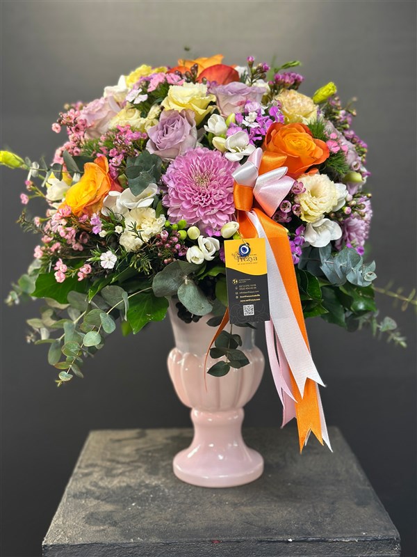 Turuncu güller, lila güller , pembe anastasialar ve mevsim çiçekleri ile hazırlanmış dekoratif cam vazo içerisindeki aranjmanımız.Vazo ve mevsim çiçekleri isteğe ve zaruriyete göre değişebilir.