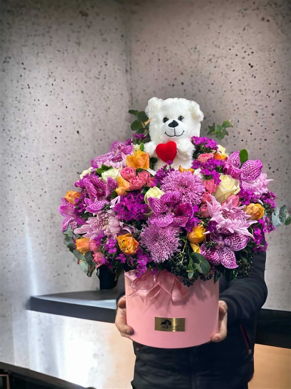 Mevsim çiçekleri güllerle hazırlanmış peluş ayıcıklı XL kutu modelimiz.