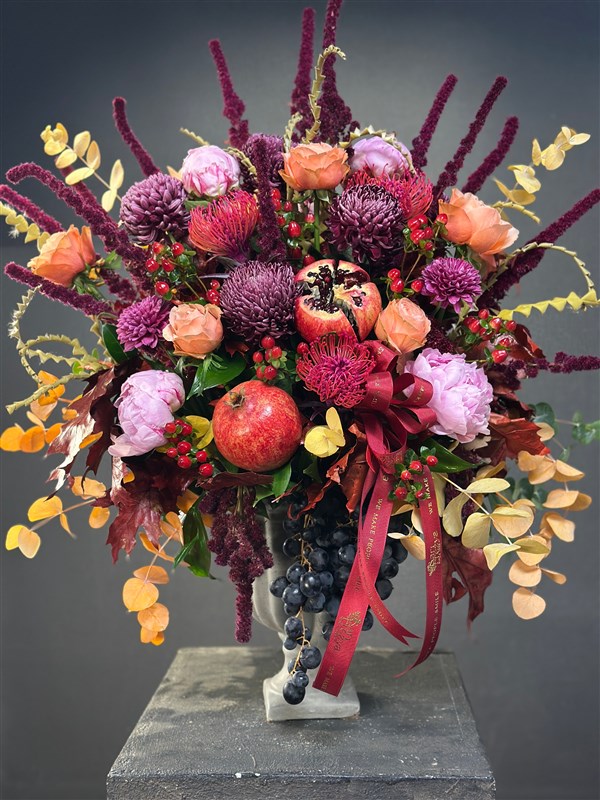 Pembe şakayıklar, bordo anastasialar, egzotik protealar, nar ve üzüm detaylarıyla zenginleştirilen bu aranjman; Fransız romantizmini, sonbaharın büyüsünü ve sanatsal dokunuşları tek bir eserde buluşturuyor.