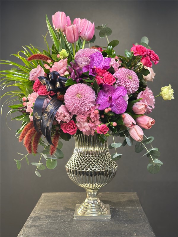 Laleler,anastasialar,vanda orkideler ve birbirinden taze çiçeklerle gümüş vazo içerisine hazırlanmış aranjmanımız.