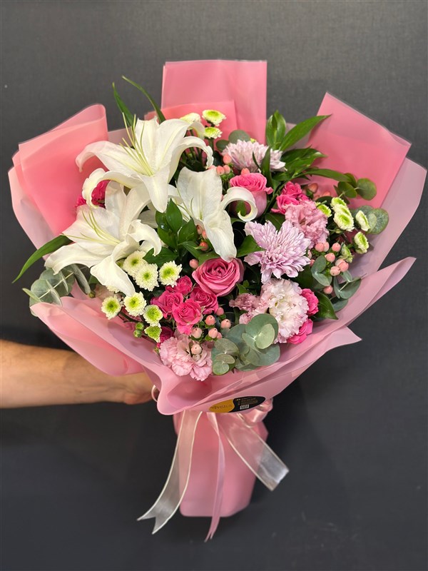 Doğanın zarafetini ve renklerini bir araya getiren bu özel buket, beyaz lilyumların saf güzelliğiyle başlıyor. Lisyantusların zarif dokunuşları, canlı krizantemler, hipericum ve pembe güllerle bir araya gelerek büyüleyici bir kompozisyon oluşturuyor. Mevsim çiçekleriyle zenginleştirilmiş bu buket, her mekânda tazelik ve neşe yayarken, sevdiklerinizi mutlu etmek için mükemmel bir hediye seçeneği sunuyor. Duygularınızı ifade etmenin en güzel yolu olan bu buket, özel anlarınızda yanınızda olacak.”
