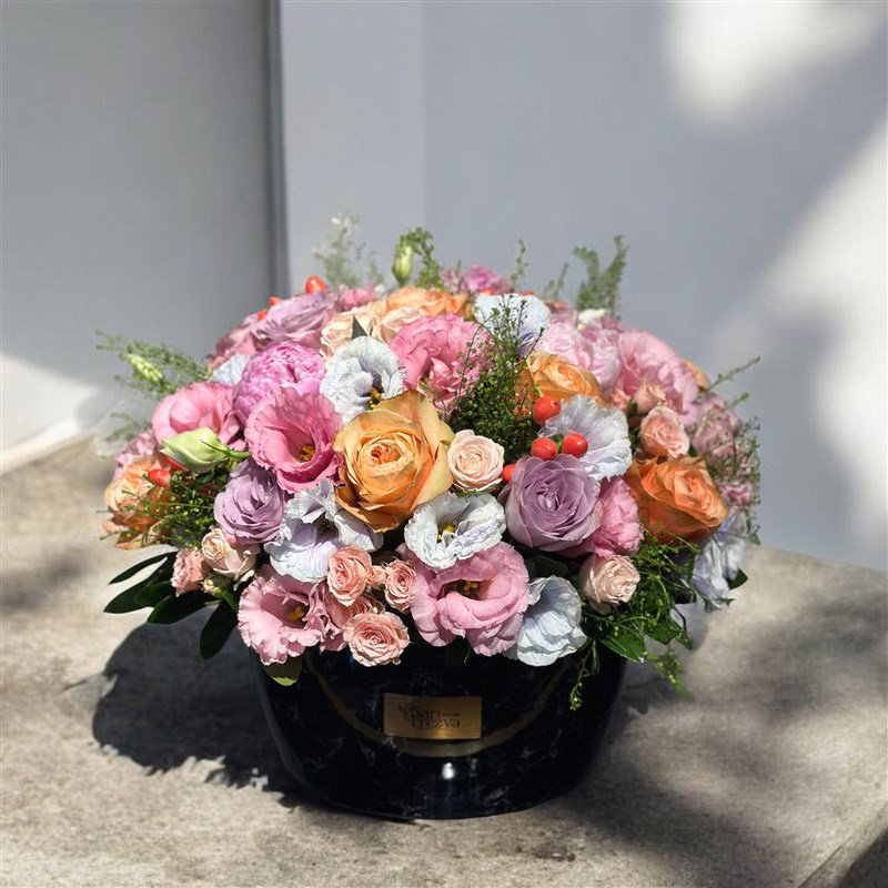 “Mermer görünümlü porselen vazo içinde sunulan bu şık aranjman, zarafeti ve doğal güzelliği bir araya getiriyor. Şakayıkların dolgun ve büyüleyici çiçekleri, hypericumların zarif dokunuşlarıyla tamamlanırken, lisyantusların narin yaprakları ve güllerin asil duruşu, bu tasarımı benzersiz kılıyor. Her detayında şıklığı ve sofistike bir estetiği yansıtan bu aranjman, özel anlarınızda zarif bir dokunuş katmak için ideal.”