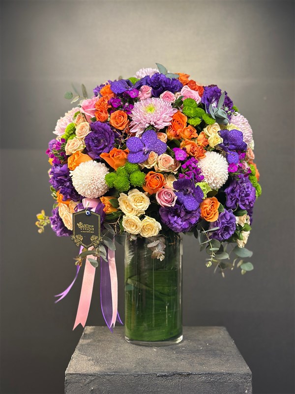 Göz alıcı renklerin eşsiz uyumuyla hazırlanan bu şahane aranjman, sanat eseri gibi tasarlandı. Morun asaletini, turuncunun enerjisini, beyazın saflığını ve pembe tonlarının romantikliğini bir araya getiriyor. Özel anlarınızı unutulmaz kılmak için tasarlanan bu aranjmanda; lisianthus, güller, anastasialar, krizantemler ve nadide orkide dokunuşlarıyla adeta bir renk cümbüşü sunuluyor.
