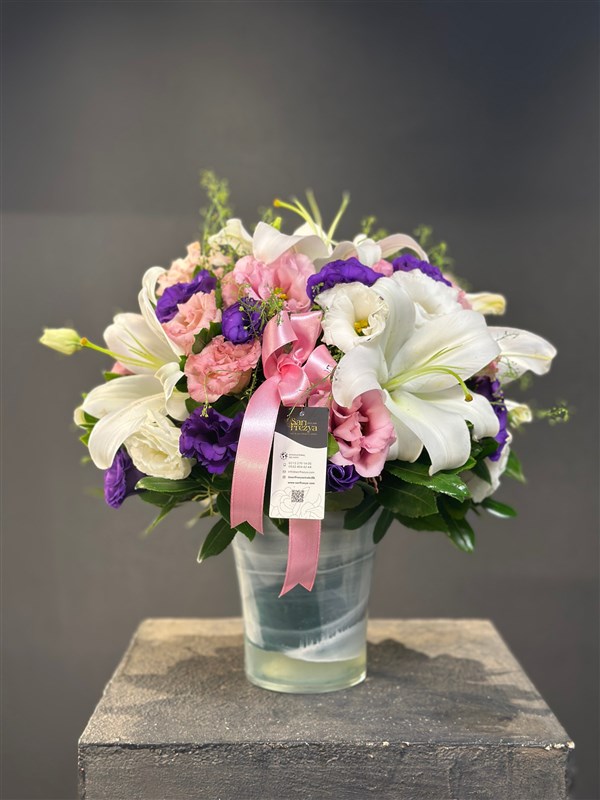 Lilyum,lisyantus, pembe güllerden cam vazo içerisinde hazırlanmış güzel aranjmanımız.