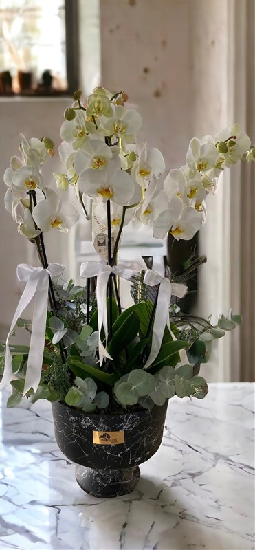 Büyük boy Tokyo orkidelerin mermer desenli vazo içerisinde sunumu bir orkide bahçesi gibi...