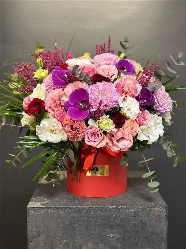 İçerisinde Anastasia , pembe güller orkideler lavantalar mevsim çiçekleriyle hazırlanmış kutu içerisinde ki şık aranjmanımız.Gittiği yerde kendini hayran bırakır, lavanta kokuları büyüleyicidir.Ürün boyu 50 cm.Ürün hacmi büyütülebilir veya küçültülebilir.Özel siparişlerinizi bütçenize göre belirtebilirsiniz.Altındaki kutu isteğe göre değişebilir.Whatsapp üzerinden fotoğraf isteyebilir , bilgi alabilirsiniz.