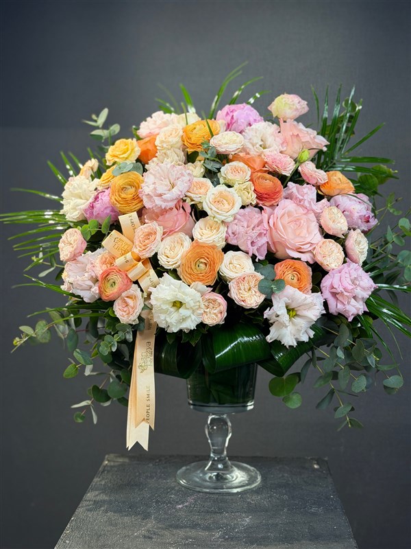 Our elegant arrangement in a glass vase, filled with peonies, pink roses, and seasonal flowers, will captivate anyone who sees it. The product is 55 cm tall. The size can be increased or decreased. You can specify your custom orders according to your budget. The vase can be changed upon request. You can request photos and information via WhatsApp.