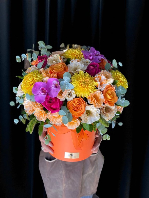 Sarı Frezya Çiçekçilik olarak, renklerin büyülü dansını bir aranjmanda buluşturuyoruz. İçerisinde , turuncu güller, sarı anastasialar, ve özel Vanda orkideleri barındıran bu kutu aranjmanı, göz alıcı renkleri ve zarif güzelliğiyle sizleri selamlıyor.