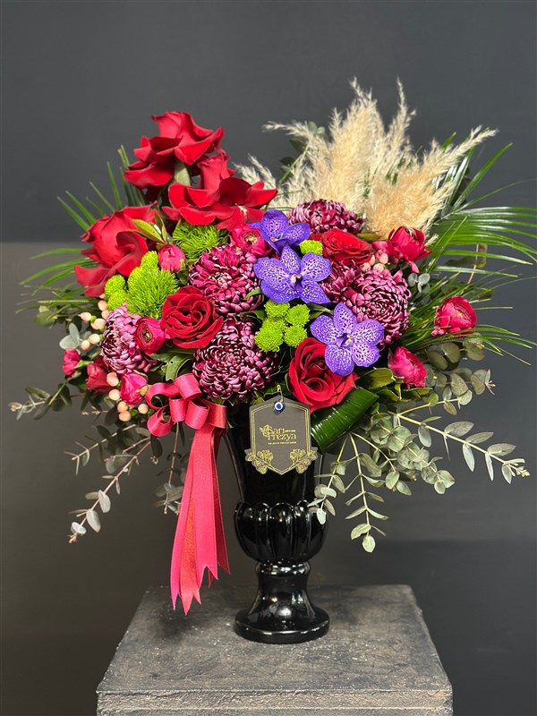Siyah cam vazo içinde modern ve göz alıcı bir tasarım… Vanda orkidelerinin egzotik asaleti, bordo Anastasia’ların derin tonları ve kırmızı güllerin tutkulu dokunuşu bir araya gelerek etkileyici bir kompozisyon oluşturuyor. Mevsim çiçekleriyle zenginleştirilen bu özel aranjman, arkasında yer alan pampaslarla sofistike ve zarif bir duruş kazanıyor.