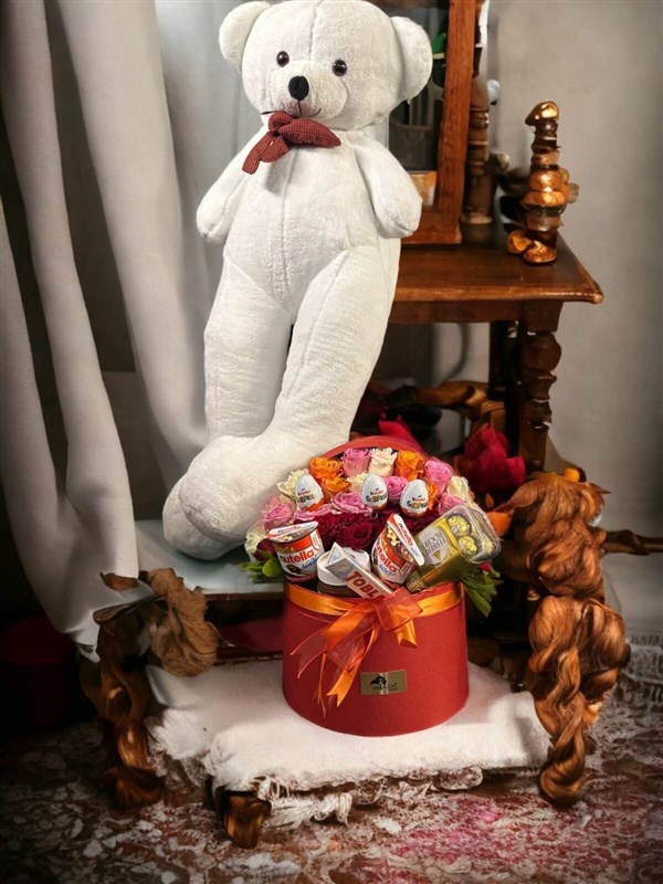 Suprise ve dev ayı 160 cm beraber hazırlanmış ürünümüz.İsterseniz görselin aynısı isterseniz kişiye özel hazırlanabilecek olan çikolatala ve güllerle hazırlanmış hediye kutumuz.Özel istekleriniz için WhatsApp üzerinden iletişime geçiniz.