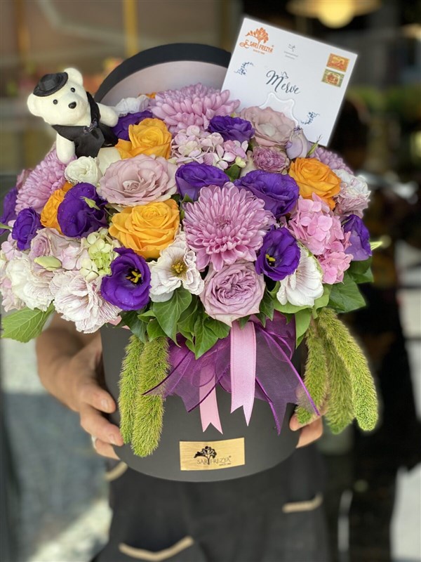 Lisyantus , anastasialar , lila güller ve mevsim çiçekleriyle hazırlanmış , mini ayıcık hediyeli kutu aranjmanımız.