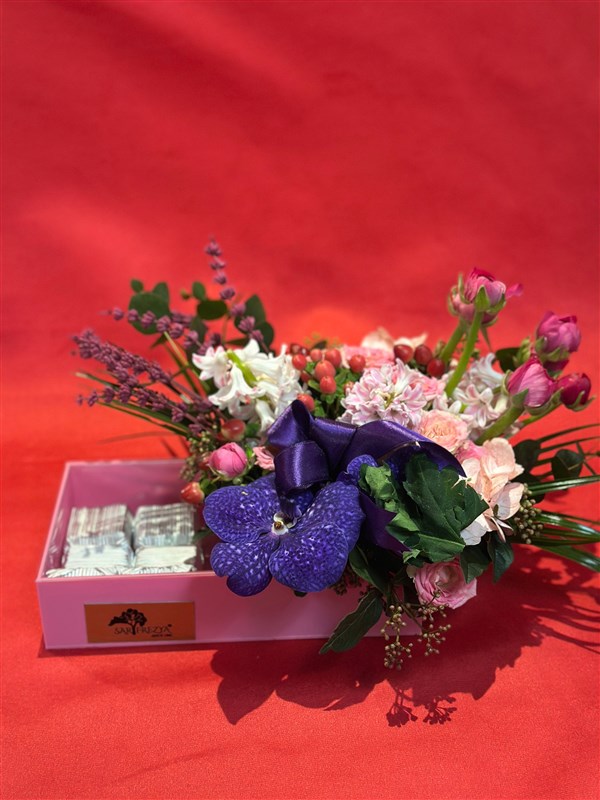 Aşkın her renk ve dokusunu barındıran bu zarif hediye kutusu, sevginizi ifade etmek için en özel seçimi sunuyor. Mor orkide ve pembe güllerin mükemmel uyumu, içinde barındırdığı şık çikolatalar ile birleşiyor. Bu romantik tasarım, en güzel anlarınızı kutlamak ve kalbinizdekileri en anlamlı şekilde paylaşmak için ideal. Sevgiliniz ya da özel biri için unutulmaz bir hediye!