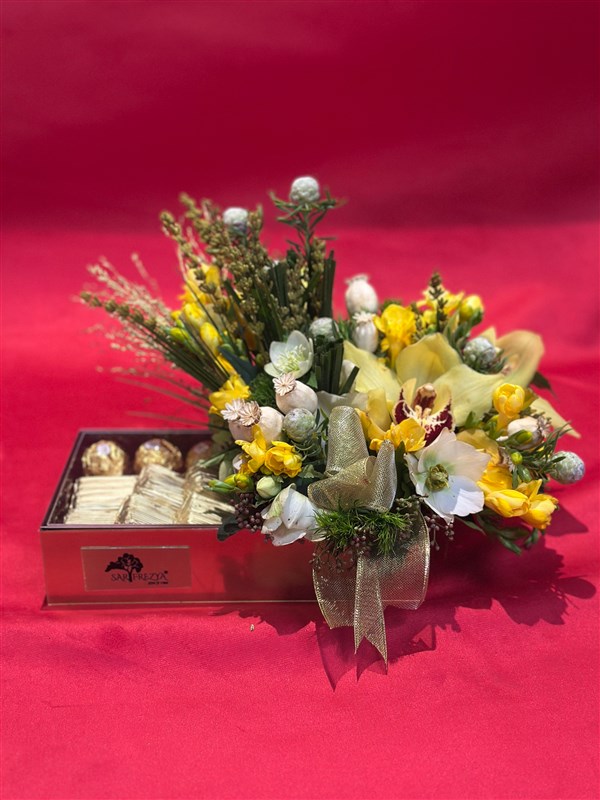 Bu zarif hediye, sevginizin ışıltısını ve tazeliğini simgeliyor. Sarı ve beyaz çiçeklerin gücüyle parlayan bu tasarım, içindeki altın kaplama çikolatalarla birleşerek tatlı bir sürpriz sunuyor. Güneşin sarı tonlarını anımsatan çiçekler ve zarif kurdele, her anınızı daha özel kılacak. Sevgilinize ya da değer verdiğiniz birine duygularınızı en parlak ve taze şekilde ifade etmek için mükemmel bir seçim!