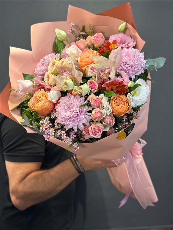 The elegance of the pink packaging brings together the cheerfulness of orange alstroemeria, the romance of pastel pink roses, the opulent splendor of anastasias, and the pure grace of white lisianthus. The vibrant harmony of colors, combined with the freshness of nature, imbues this bouquet with an energetic spirit.