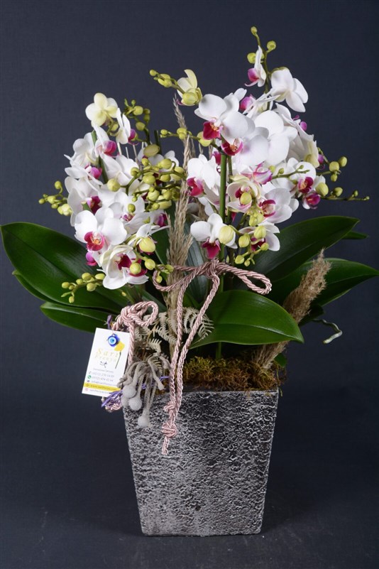 Çok dallı ve çok goncalı belissimo türü orkidemiz dekoratif el yapımı seramik içerisinde ev ve ofislerinize renk katacak .Vazo isteğe ve zaruriyete göre değişebilir.