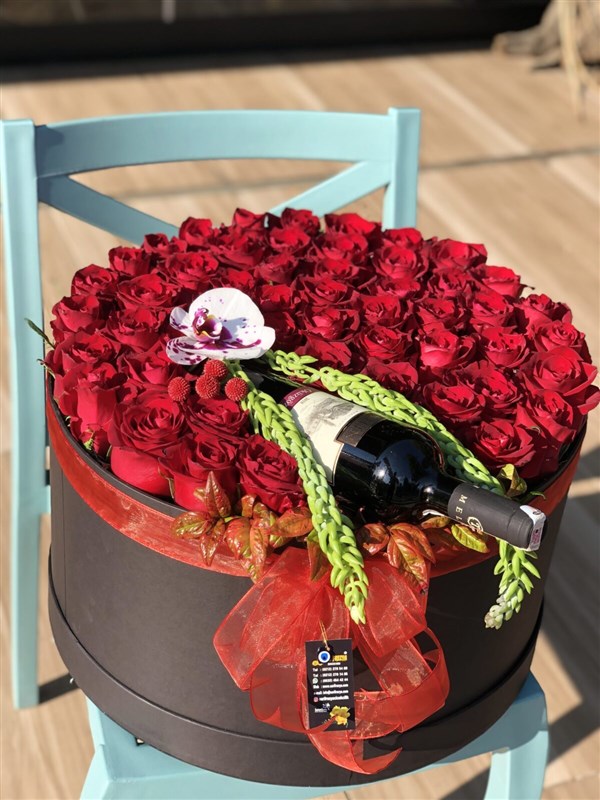 Büyük kırmızı güller ve orkidenin şarapla kutu içerisindeki muhteşem şıklığı.İçki fiyata dahil değildir.